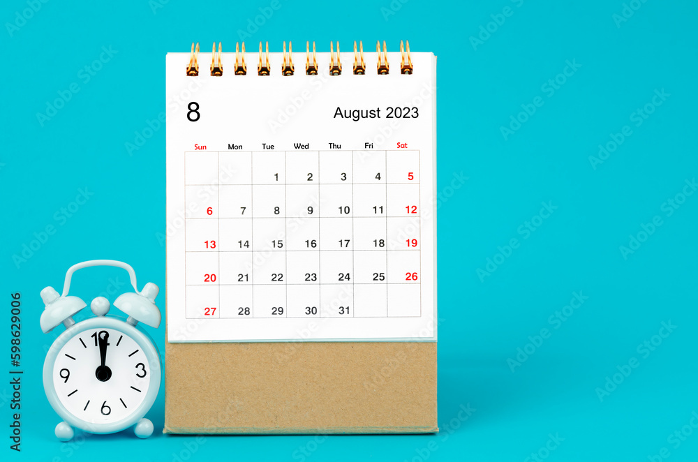 The August 2023 Monthly desk calendar for 2023 year and alarm clock on blue background.