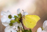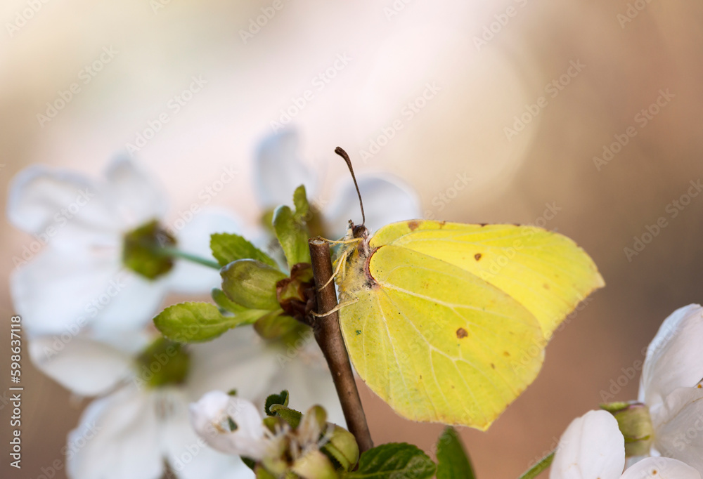 Wiosenny motyl Latolistek Cytrynek na kwiatach wiśni