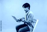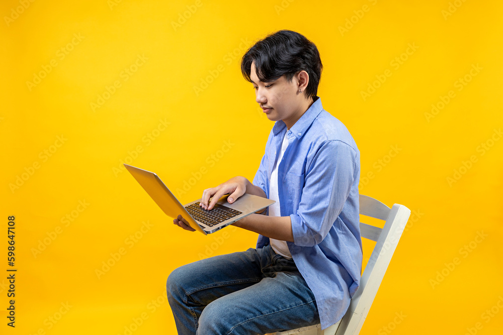 Portrait of young handsome Asian man use work on laptop computer isolated in studio yellow background