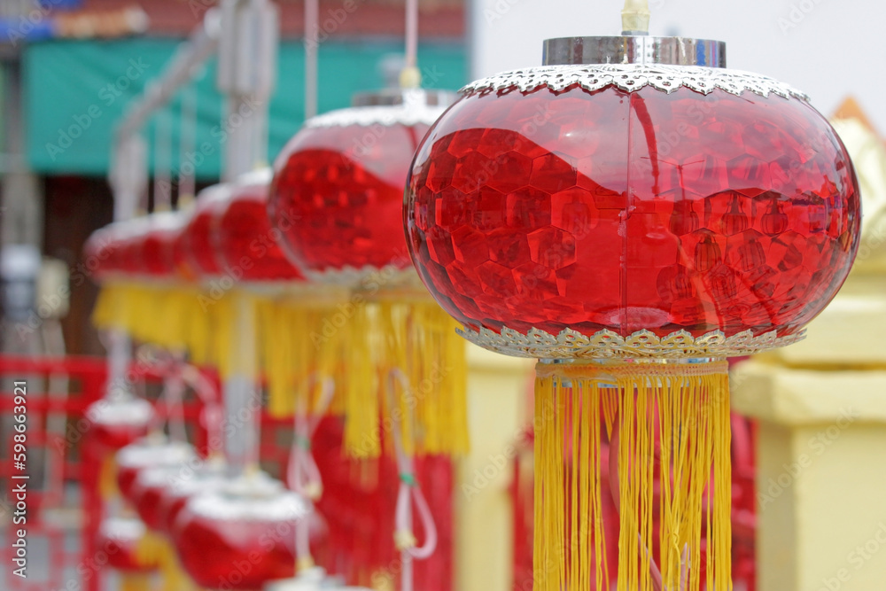 A row of decorative red Chinese glass lanterns with gold tassles. Electric outdoor lights for deoration at a Chinese Buddhist temple in southeast Asia. Daytime, no people.