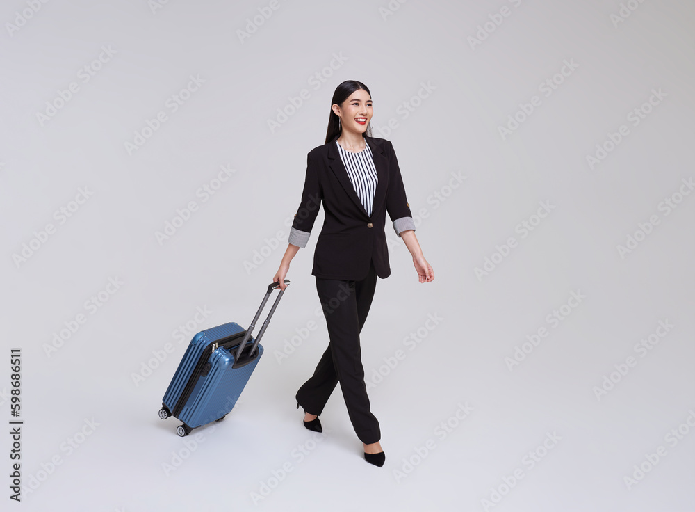 Asian executive businesswoman walking in an empty airport hall with a suitcase isolated on studio white background. business travel