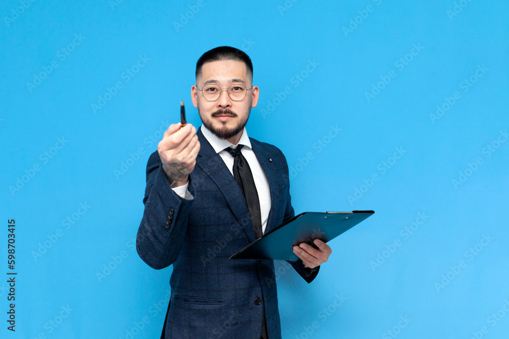 successful asian businessman in suit holding clipboard and pointing with pen at copy space, korean businessman