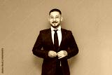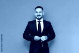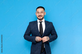 portrait of successful asian businessman in suit and glasses on blue isolated background, korean entrepreneur