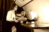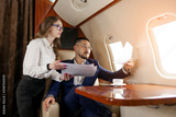 successful asian businessman with female colleague in suit and glasses sits in private jet and looks at documents