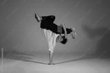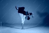 young guy dancer is dancing break in neon lighting, male acrobat is doing trick and dance exercise