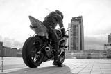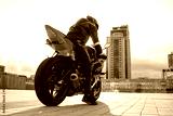 guy motorcyclist in professional protective equipment and helmet sits on sports motorcycle against the city