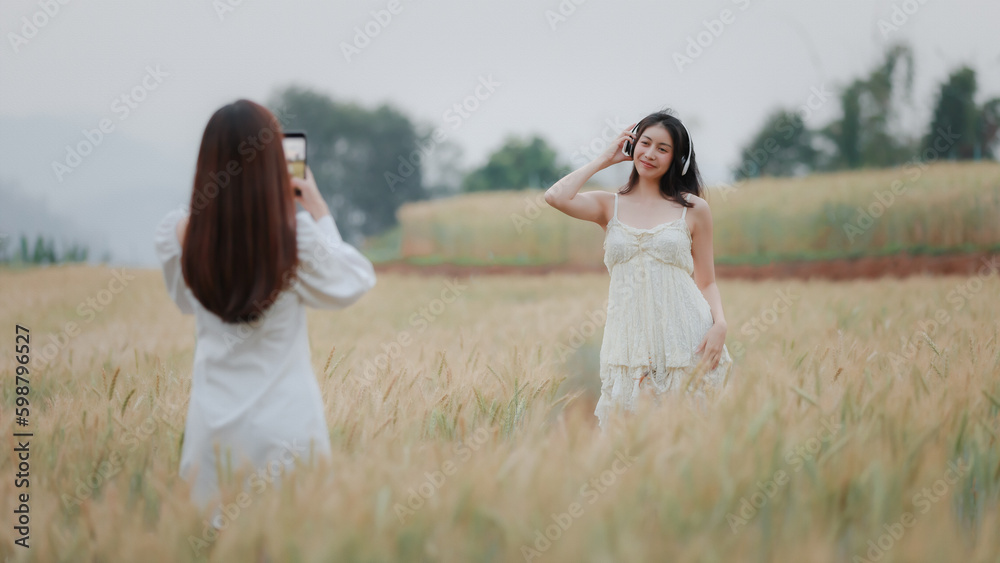 Happy smiling young beautiful woman wearing white dress taking selfie and headphone wireless while walking in the golden barley filed