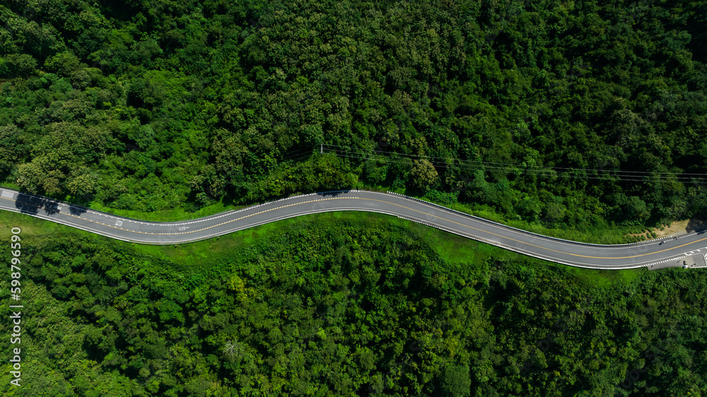aerial view ROAD No.1081 or shape number three of winding mountain road between Pua District, Nan Province, Thailand is highlight point and landmark that tourist like to take pictures