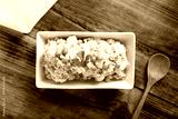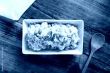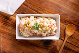 Russian Salad, also known as Olivier Salad. Very popular dish in several countries, the main ingredients are commonly potatoes, mayonnaise and vegetables such as peas, carrots, boiled eggs or chicken
