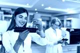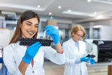 Female Research Scientist Holds Test Tubes with Blood Samples before Puting them into Analyzer Medical Machine. Scientist Works with Modern Medical Equipment in Pharmaceutical Laboratory.