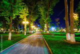 City night park in early summer or spring with pavement, lanterns, young green lawn and trees.