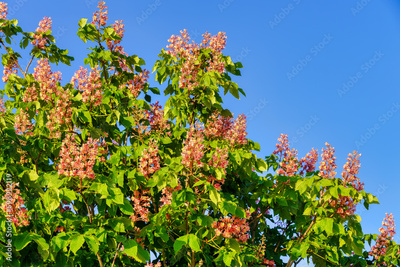 Blossom tree branches with young leaves illuminated by sunlight in spring.