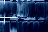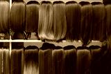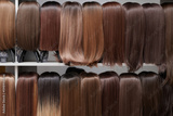 Showcase of natural looking wigs in different shades of brunette fixed on the wig holders in beauty salon. Row of mannequin heads with variation colors hair on shelf in wig shop