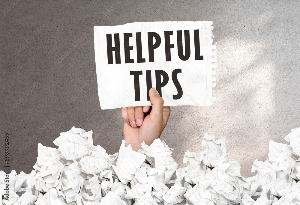 Hand holds a piece of paper with text Helpful tips on a gray wall background