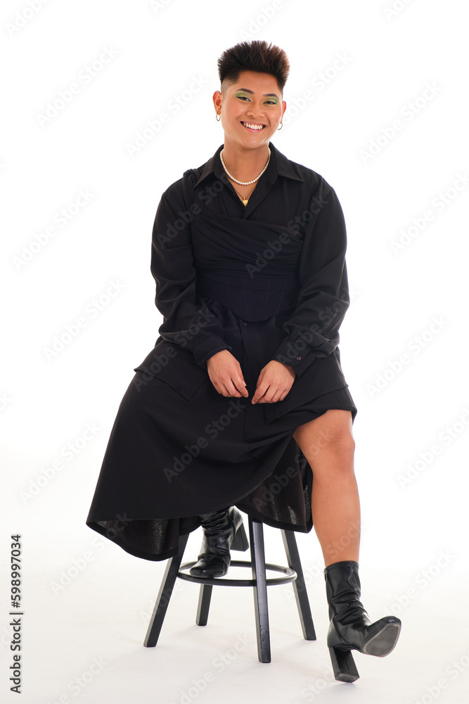 portrait of non-binary young asian person smiling sitting on a bench over white background