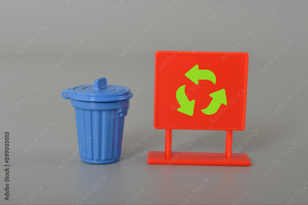 Toy dustbin and recycle symbol. Loaded into a recycling bin