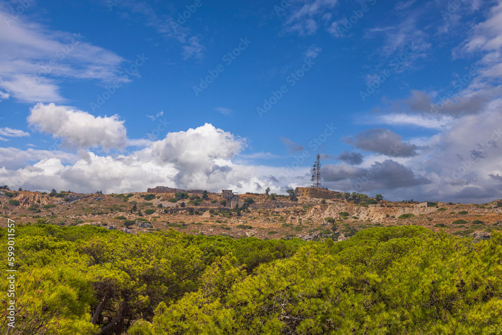 Beautiful view of mountain landscape of island of Rhodes with TV tower on top of mountain on background blue sky with white clouds. Greece.