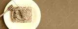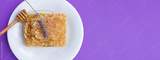 Honeycomb and lavender flower in the white plate on the purple background. Copy space. Top view.