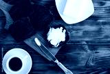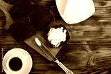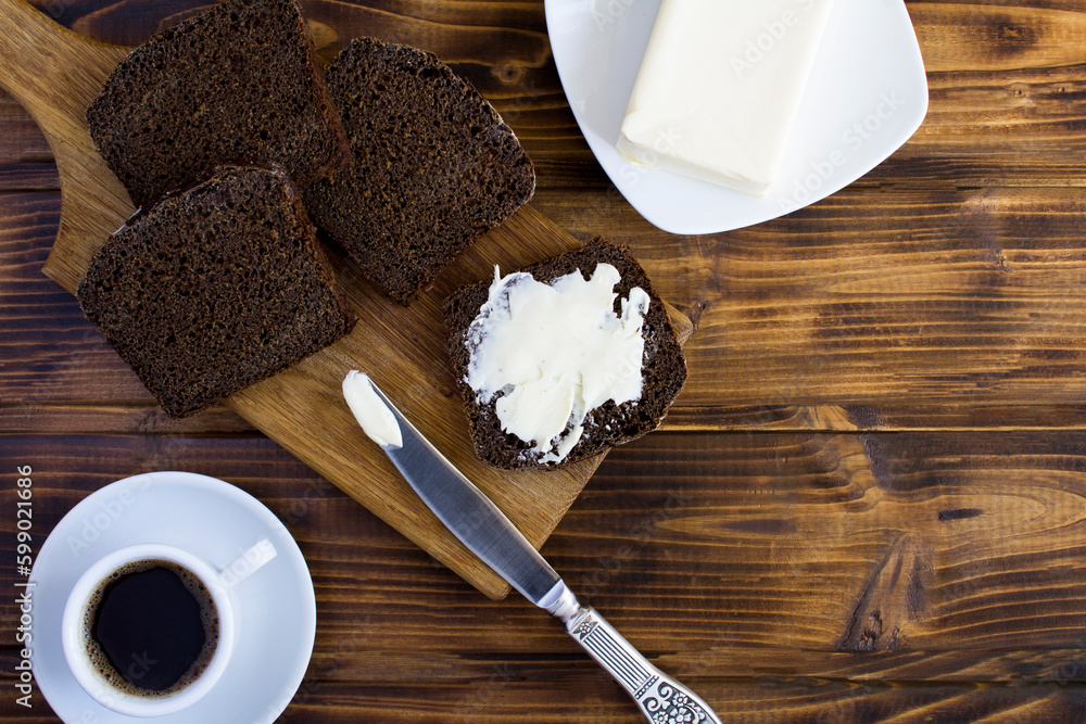 Breakfast with coffee and rye bread with butter on the wooden background. Top view. Copy space.