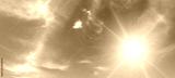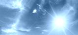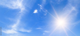 There are light clouds and a bright sun in the blue sky. Wide photo.