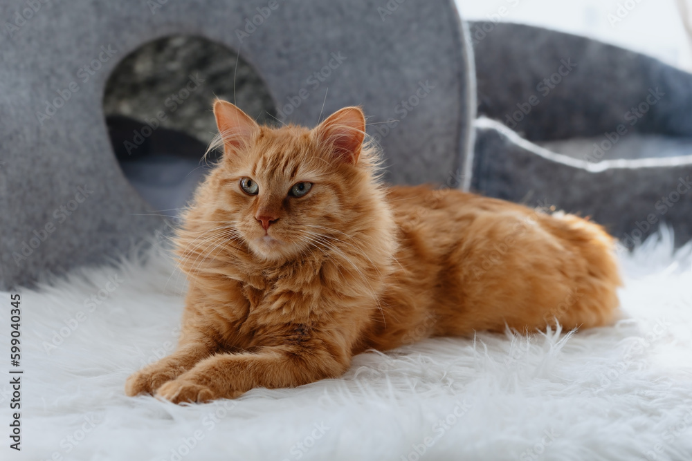 A ginger cat lies on an artificial fur rug near the cat house