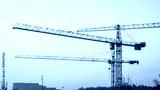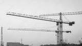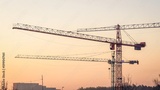 Construction site on the evening sky. Building site with three hoisting, cranes on red sky background