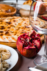 Khachapuri stuffed with minced meat, herbs, cheese with khinkali and pomegranate.