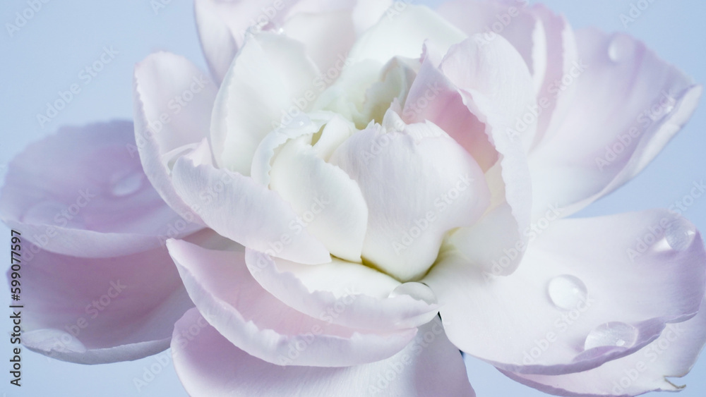 Macro photo of white-pink carnation flower bud close-up on blue background.Texture soft petals of carnation.Beautiful banner of flowers.Scientific name is Dianthus.Wedding postcard.Mothers day flower