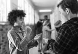 Im going to win this one. two young boys standing in the school hallway together and playing a game of rock, paper and scissors.