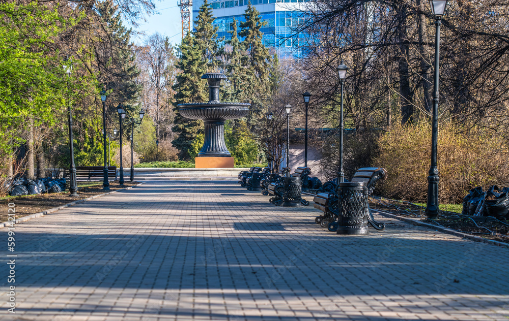 Black garbage bags in the park. Cleaning the park in the spring.