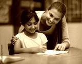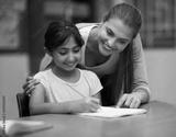 School, study or learning with a student and teacher in a classroom together for writing or child development. Education, scholarship and teaching with a woman tutor helping a girl child in class