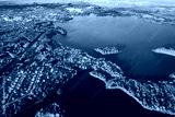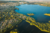 Lyepyel, Lepel Lake, Beloozerny District, Vitebsk Region. Aerial View Of Lyepyel Cityscape Skyline In Autumn Morning. Morning Fog Above Lepel Lake. Top View Of European Nature From High Attitude In