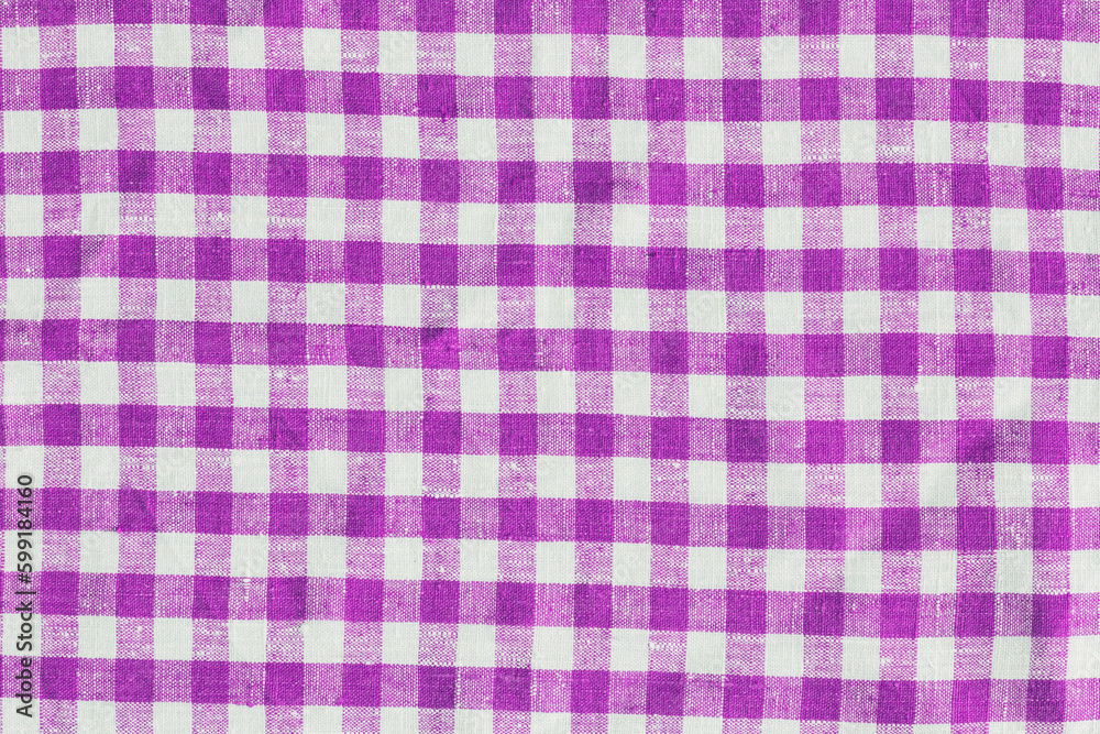 XXXL Size Old Retro Natural Classic Design Linen Plaid Fabric Tablecloth. Abstract Background, Purple And White Colors. Checkered Tablecloth Fabric. Tartan Square Pattern As Background. Linen Plaid