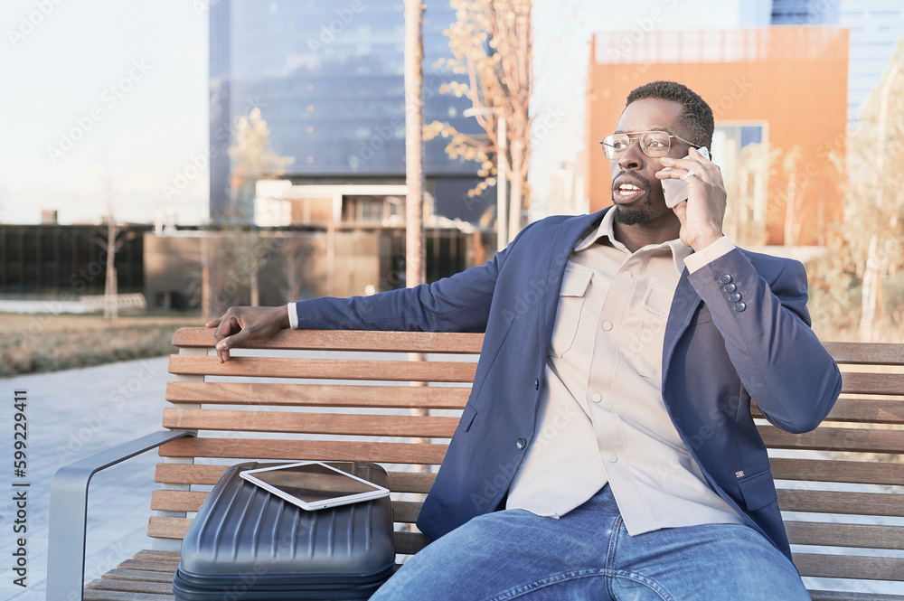 Handsome young black businessman using a mobile phone outdoors. He is wearing blue jeans and blazer. Business journey concept