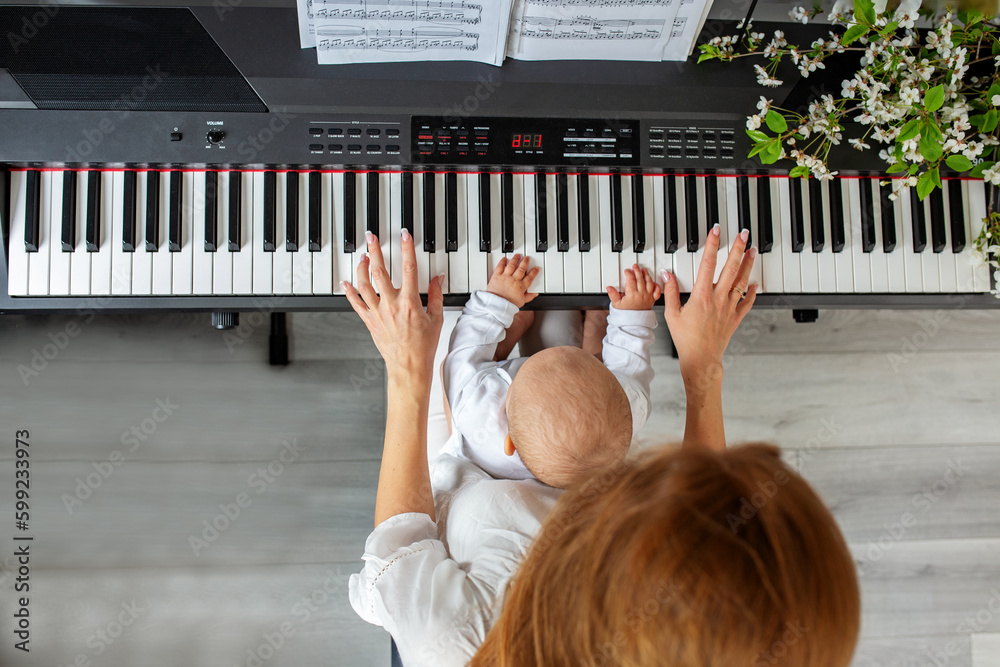 Mother and baby daughter playing piano. Baby development. Sensory experience. Early years. Top view