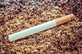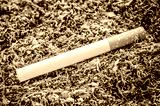 Cigarette with tobacco in the background. Cigarette concept to be used as a representation of smoking addiction. Photo in shallow depth of field.