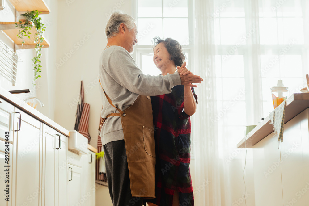 sweet good old day asian senior retired marry couple grand parent make lovely dance together while preparing breakfast at pantry kitchen daytime at home,morning dancing with love of grand parent home