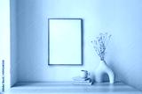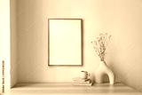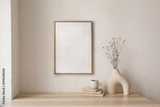 Neutral home still life. Decorative boho interior. Vase with bouquet of dry plants, grass on wooden table. Blank picture frame mockup hanging on wall. White cup of coffee or tea,books. Artistic poster