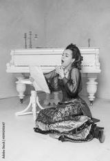 Shoked woman wearing green medieval vintage Victorian Style dress sitting on the floor and holding letter