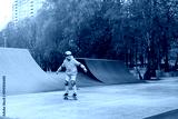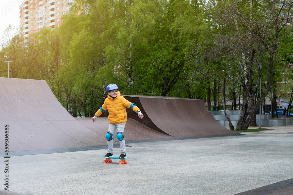a child rides a blue city cruiser, a plastic bright skateboard, in a skate park on a halfpipe