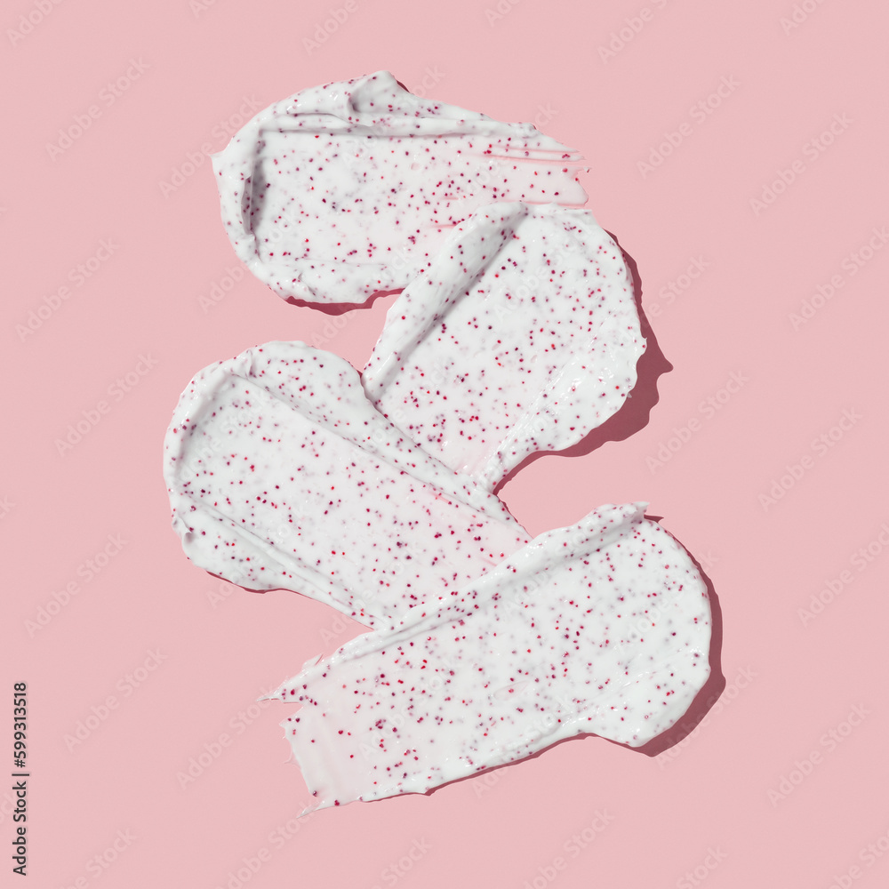 Smears of body scrub on pink background. Fruit and berry body scrub texture of the swatch. Cosmetic smear