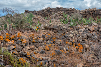 Rocky landscape with prickly pears on the island of Fuerteventura, Canary Islands, Spain