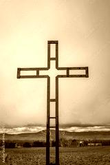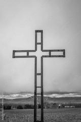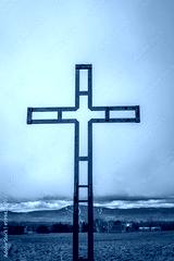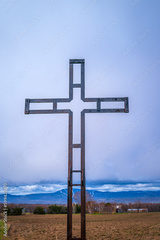 Roadside cross in Saint-François-de-l'Île-d'Orléans, Orleans Island in Quebec, with the view of Mont Sainte-Anne mountain peak ski resort covered with snow in Beaupré, QC
