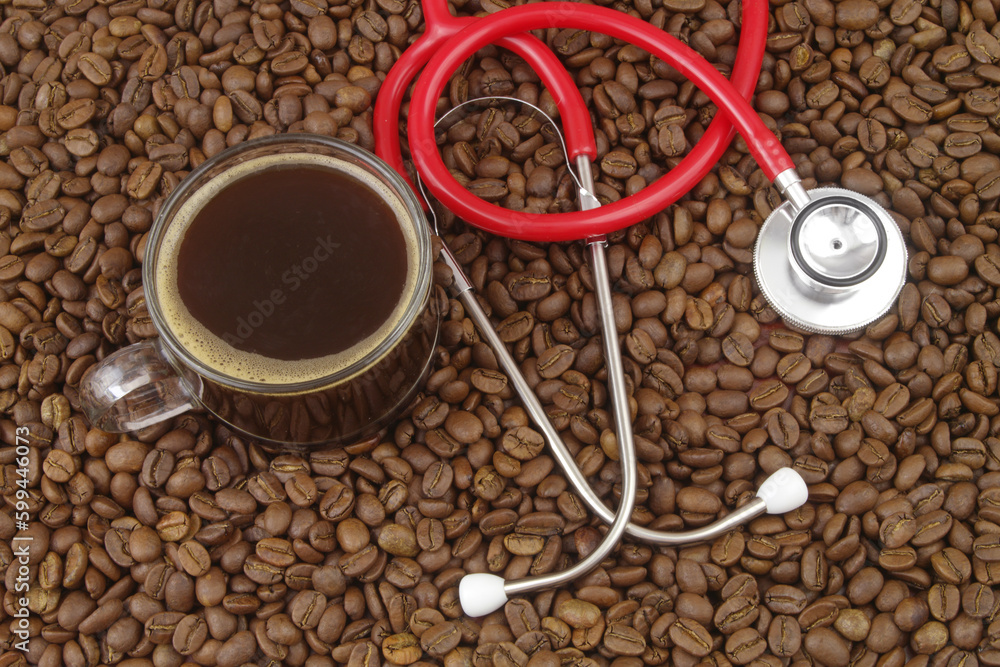 Coffee affects blood pressure and heart health concept. Coffee cup and red stethoscope on roasted coffee beans.