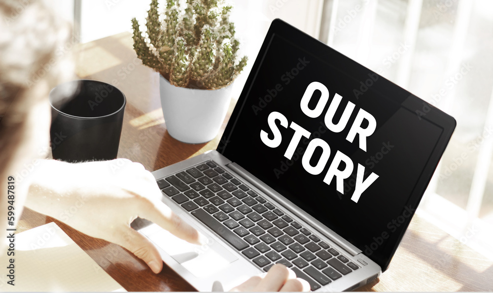 Businessman typing text Our story in his laptop
