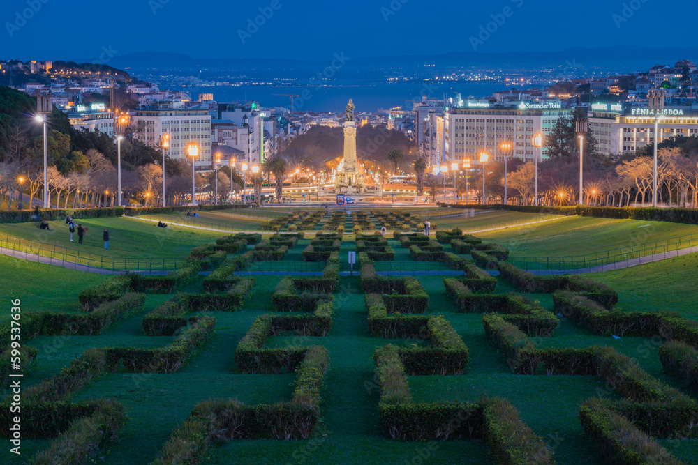 Eduardo VII Park in LIsbon at sunset with the city in the background