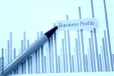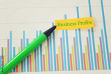 Green pen pointing to the word business profit point on a paper graph background.