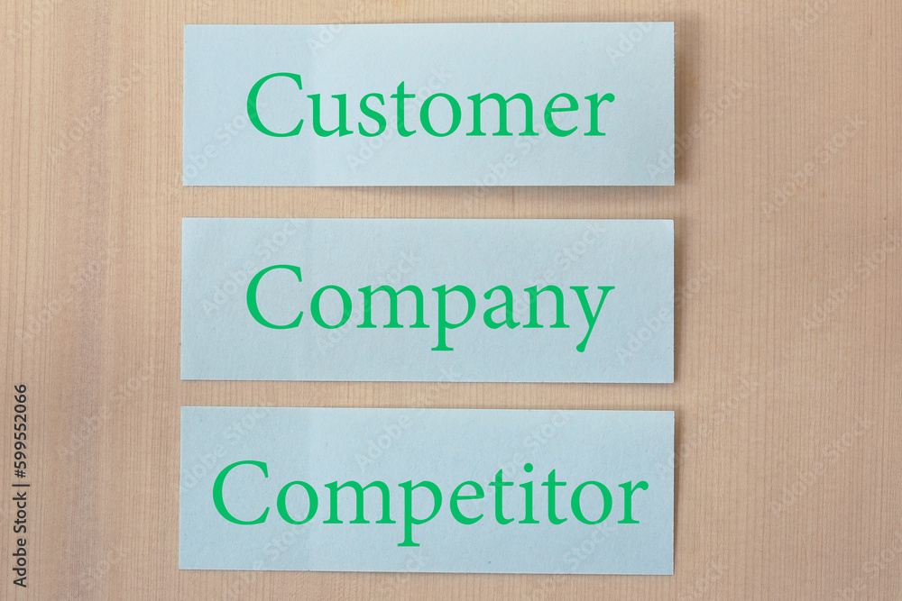 Green text on blue paper with the words of Customer, Company and Competitor.