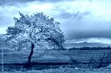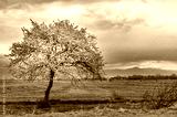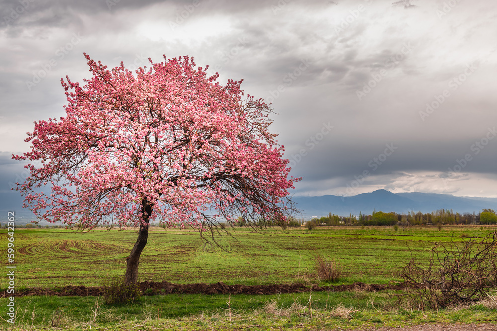 Lonely flowering fruit tree in spring in a mountain valley. Tree with pink flowers. Cloudy sky over the mountains.