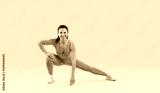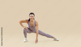 Happy athletic flexible woman doing leg stretching fitness exercises on beige studio background. Cheerful smiling middle aged lady in lilac activewear doing lateral lunges. Gym workout concept